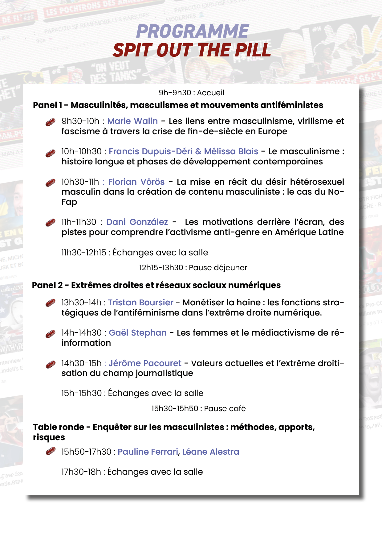 Cette journée d’étude organisée par les étudiant·es du Master 2 " Médias et rapports de classe, race, genre" se propose d’interroger la production contemporaine des discours masculinistes en ligne, ainsi que leur articulation avec les stratégies de l’extrême droite organisée.